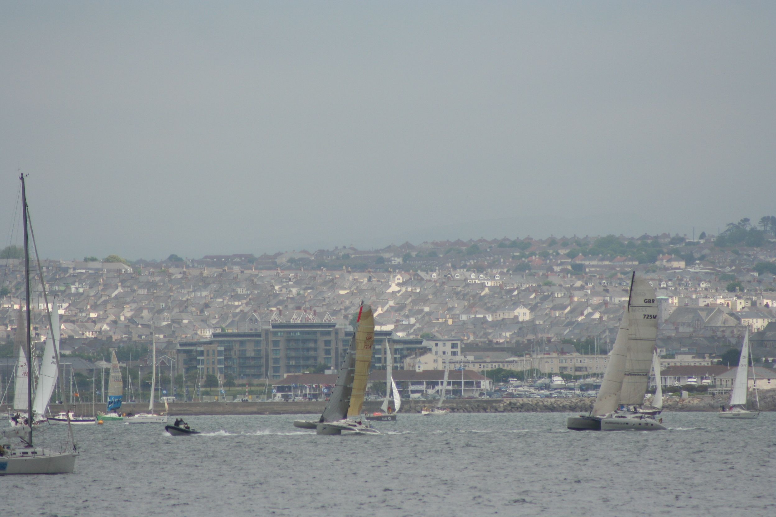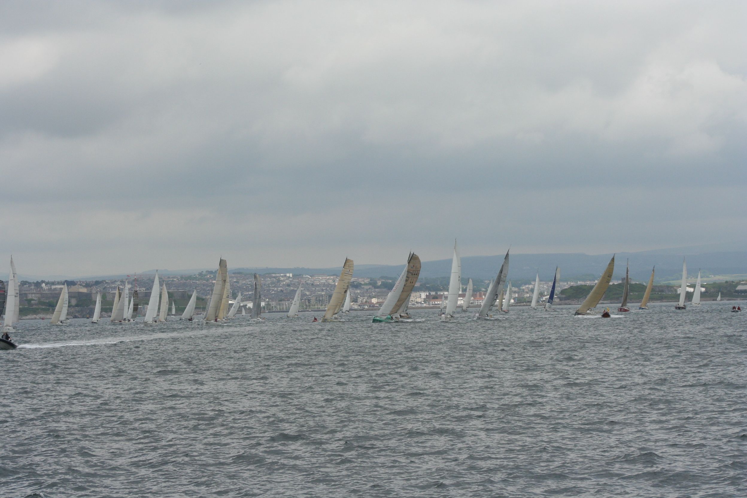 In an English summer day of 10 knot winds and occasional sunny spells, out to the tidily organised start, taking up most of Plymouth Sound with spectators held away by an armada of control boats. The planning was spot on, all credit to the RWYC.