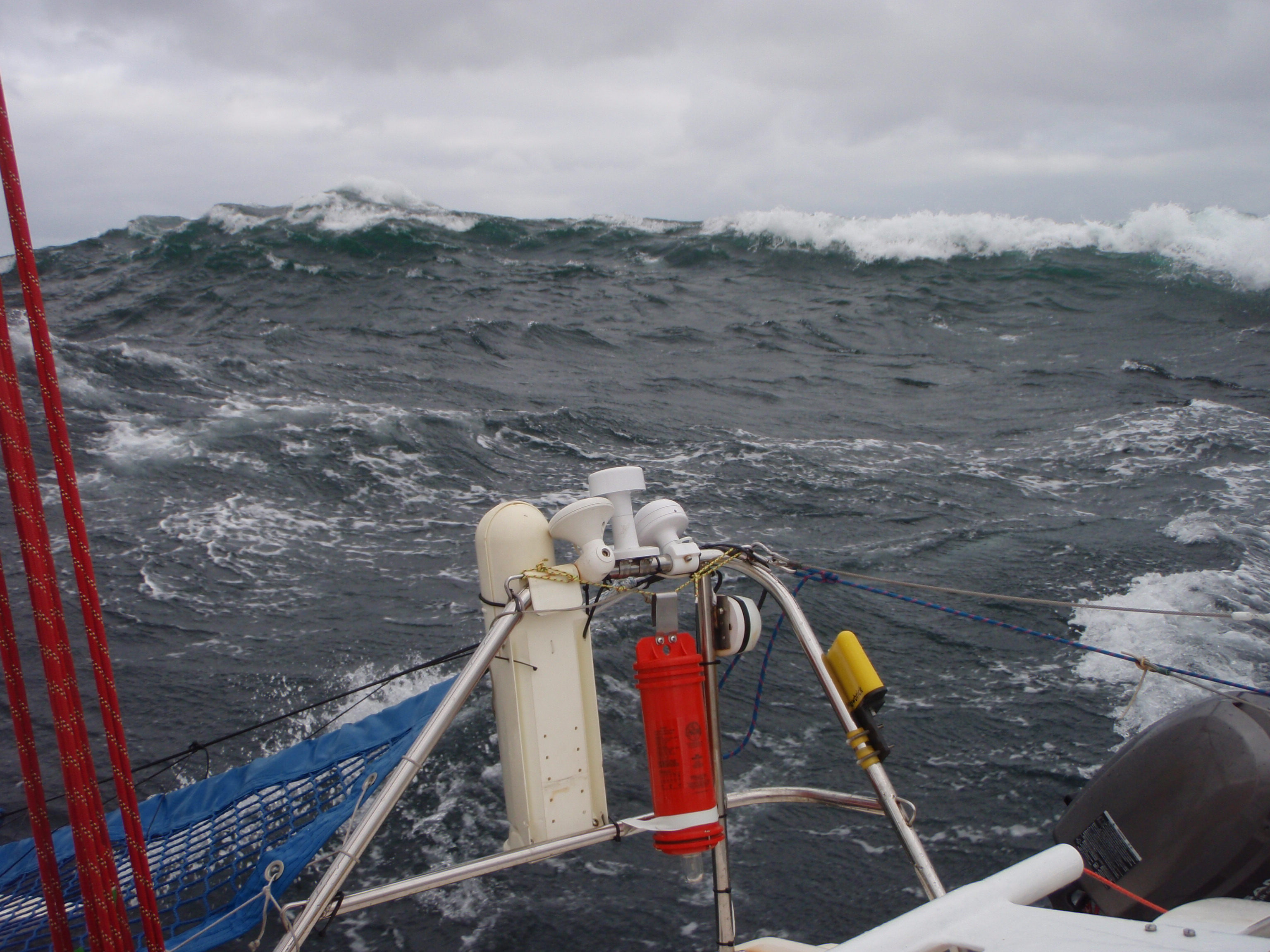 Otherwise the boat was just great. It wasn't designed to be a heavy weather offshore racer, yet that's what we did with it. It simp[ly looked after us. When you're on top of a breaking wave with neither ruddeer nor bow in the water, you're in the hands of the designer at that point. We just didn't worry. It flexed a lot but is clearly designed to do so and hasn't suffered from it and the winter's preparation for leak-stopping worked brilliantly. Farrier designs are prone to leaks above the waterline (as my 27 and 28r lead me to discover) but we have this one nailed down well. The only real leak was from our fixing the life-raft (52 kg) to the cockpit floor but we had little choice about where to put it.